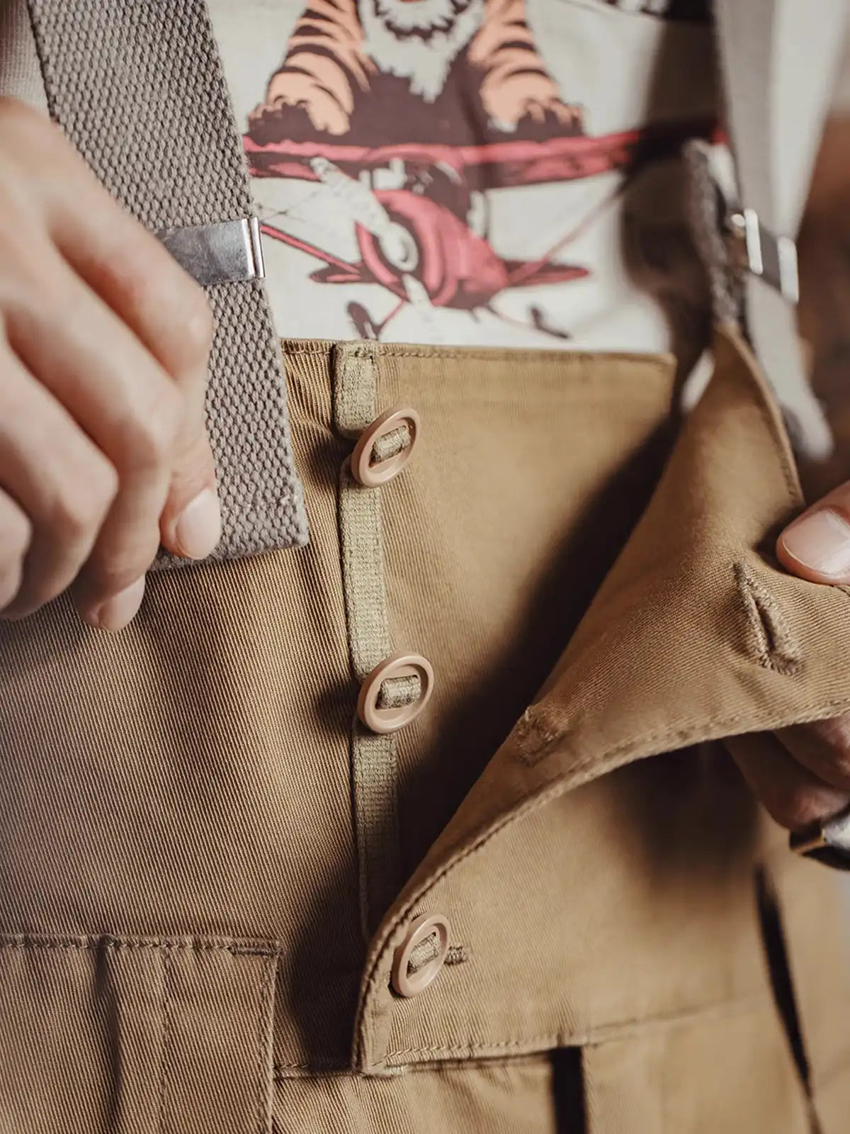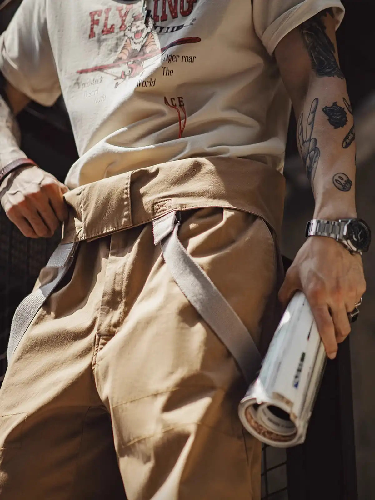 90年代フライトパンツをベースに改良した、多ポケット仕様のヴィンテージワイドサスペンダーパンツ。