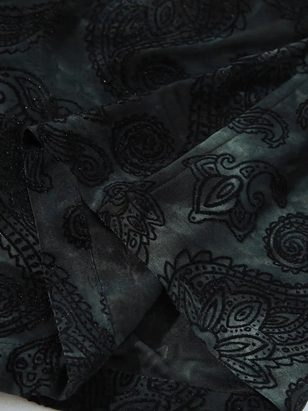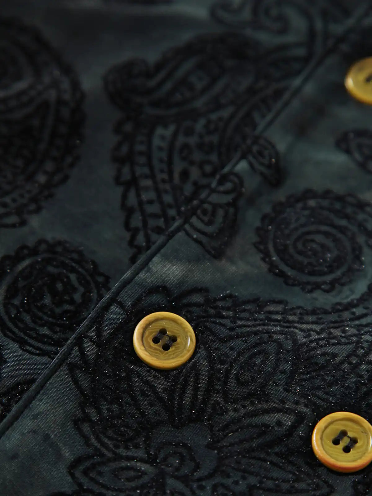 ポリエステルを主体に、アクリルとスパンデックスをブレンドした生地を使用。軽やかでシワになりにくく、ストレッチ性を持ちながらも上品なジャカード織りの質感が特徴。深みのあるダークトーンにクラシックな意匠を施し、ヴィンテージの趣とラグジュアリーさを融合。五分袖のゆったりとしたシルエットは体型を選ばず、余裕あるスタイルを演出。金色調のボタンが全体を引き締め、リゾートからナイトシーンまで幅広く対応可能。