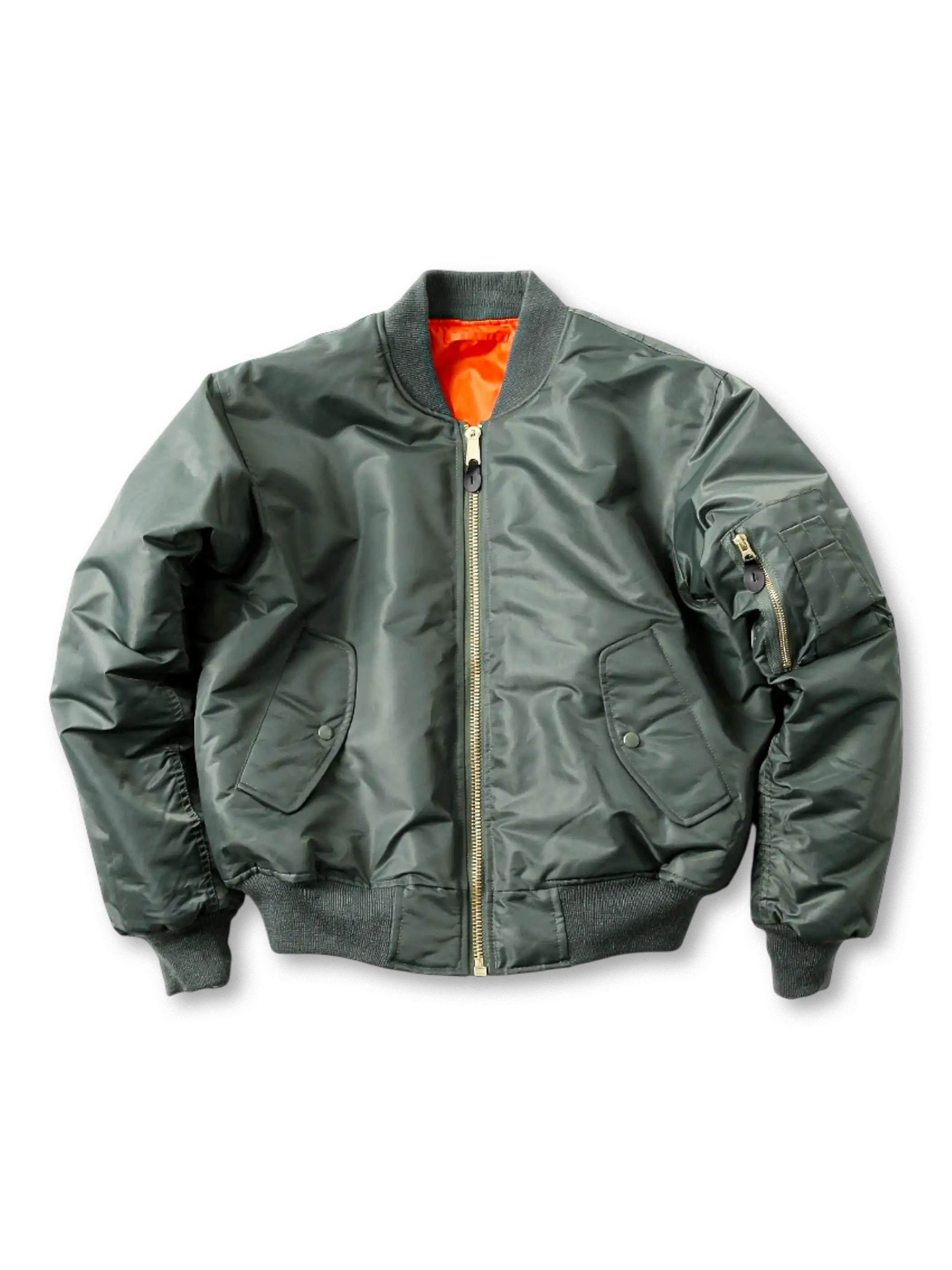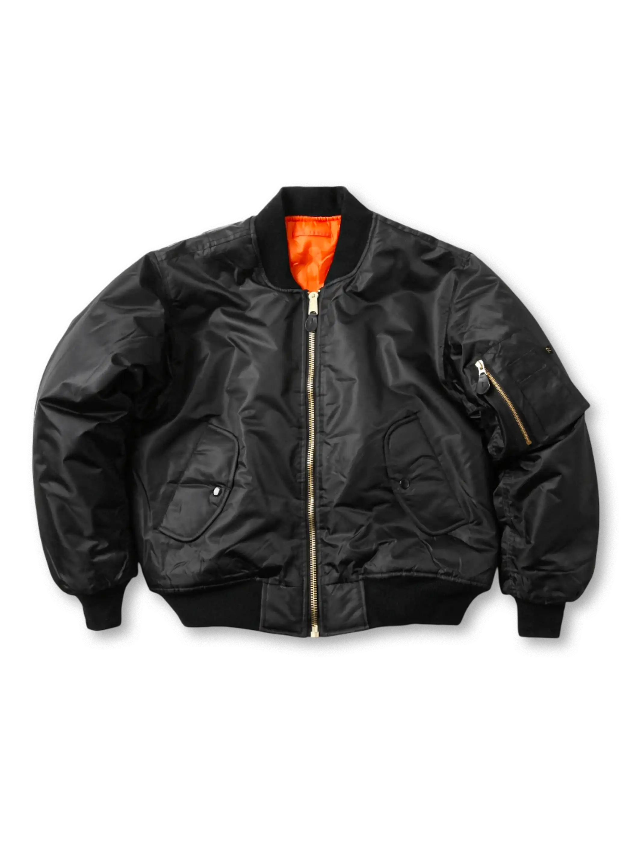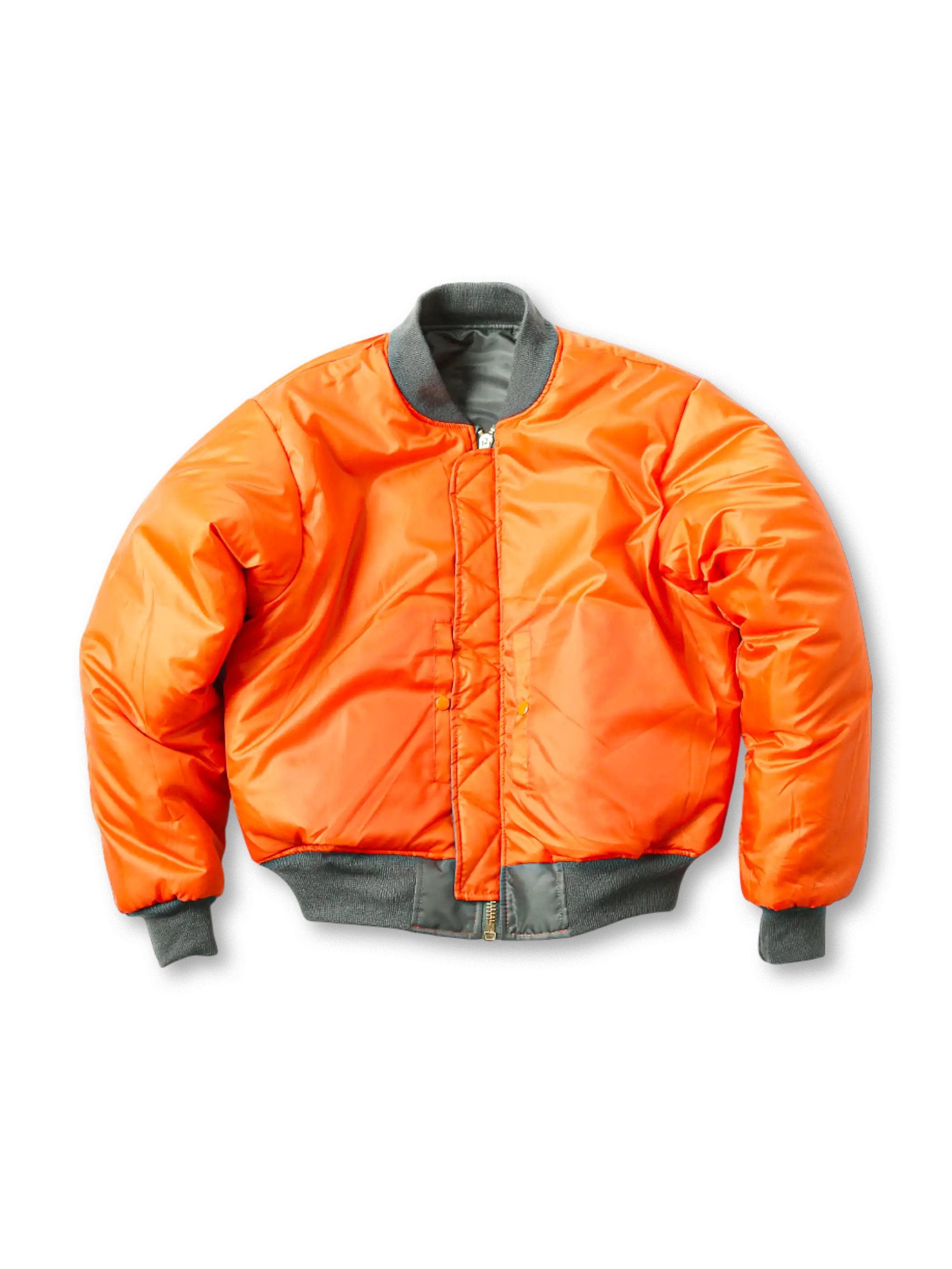 アメリカ空軍パイロットのために設計されたMA-1をベースに、現代的な素材とシルエットで再構築。66ナイロンツイル生地を使用し、撥水・防風性を確保。内側には鮮やかなレスキューオレンジを採用し、リバーシブル仕様を踏襲。袖にはユーティリティーポケット、ウエストにはスナップ付きフラップポケットを配置。裾と袖口のリブが冷気を遮断し、1800g相当の中綿が-10°C〜10°Cの気候にも対応。全体のシルエットはオリジナル同様、袖周りにゆとりを持たせたショート丈のボリュームフォルムで、現代のオーバーサイズスタイルにもマッチする。生地の厚さ:厚手フィット:ルーズフィット伸縮性:なし(リブ部のみあり)丈:短丈