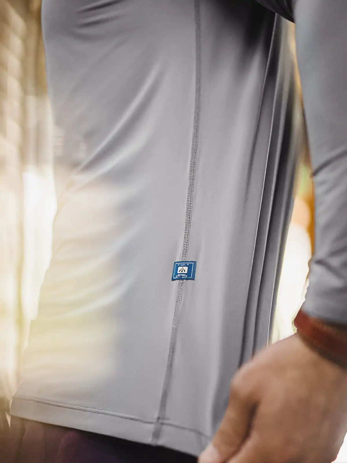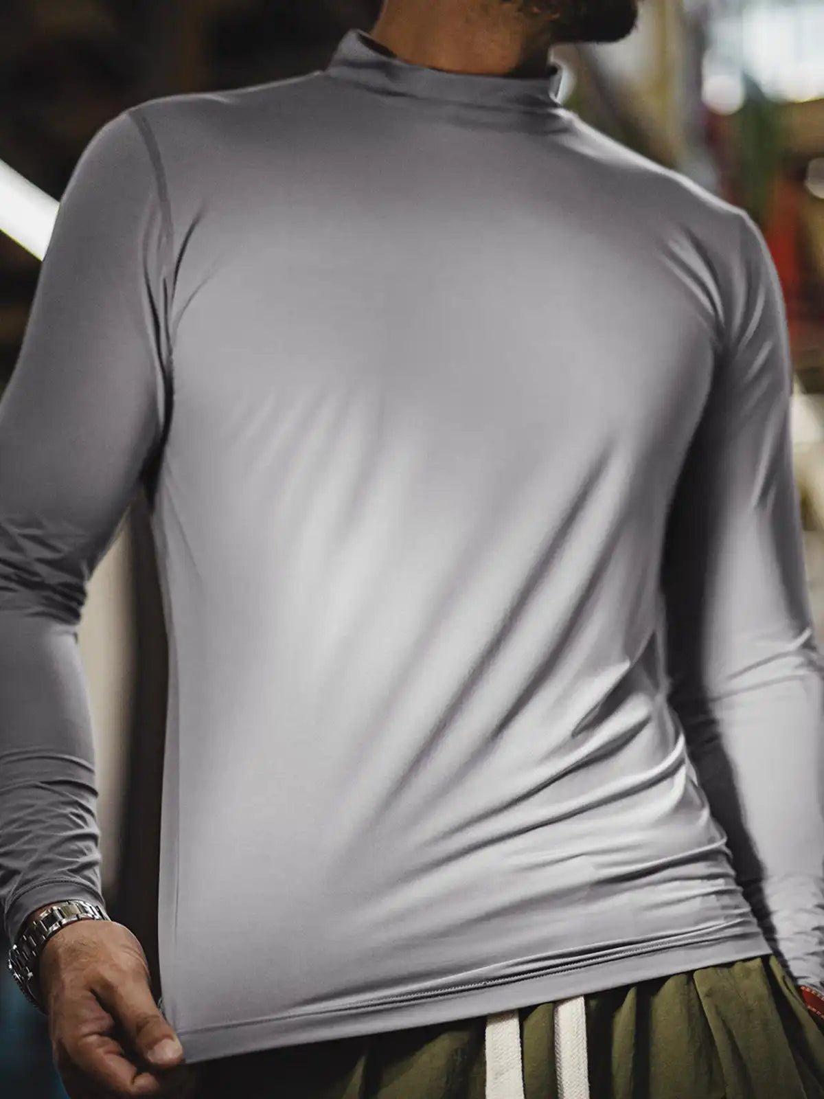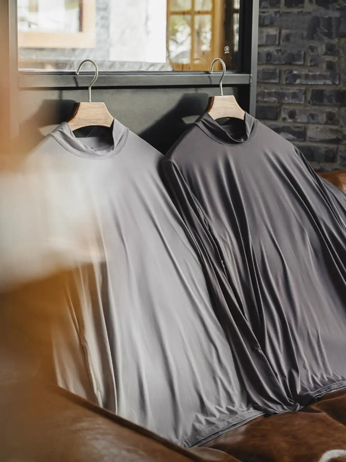 ナイロン84.6%とスパンデックス15.4%を配合したハイテク素材を使用。熱い時は透湿性で涼しく、寒い時は適度な保温力を発揮する自動温度調整機能を備える。滑らかな冰絲のような肌触りで、伸縮性に優れ、フィット感のあるシルエットが特徴。縫製には四本針六本糸のフラットシーマ構造を採用し、縫い目のごろつきをなくし「無感覚」の着心地を実現。スポーツから日常のレイヤードスタイルまで幅広く活用可能な一枚。