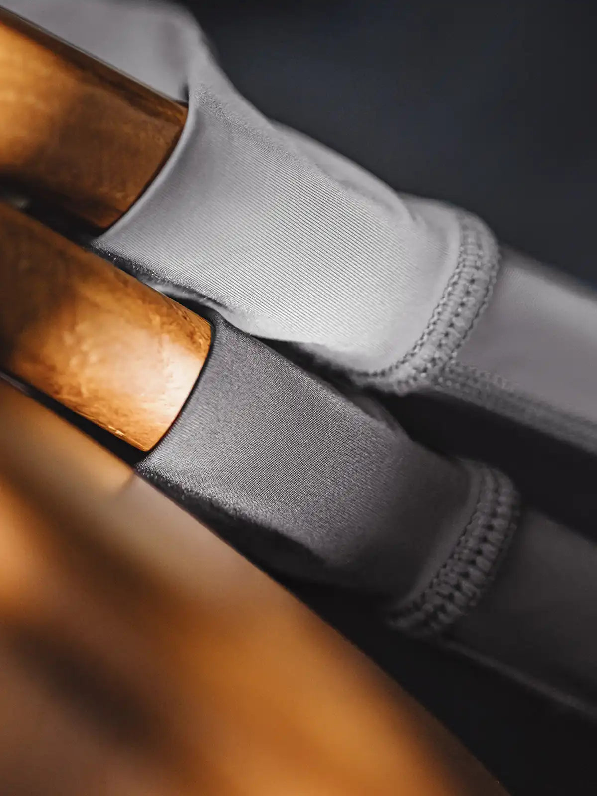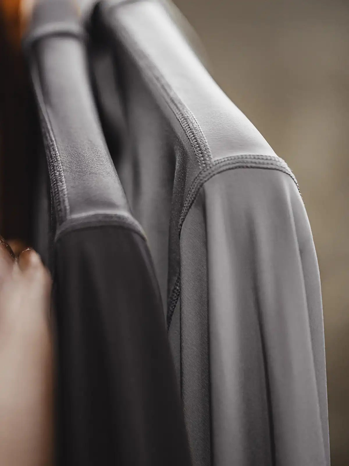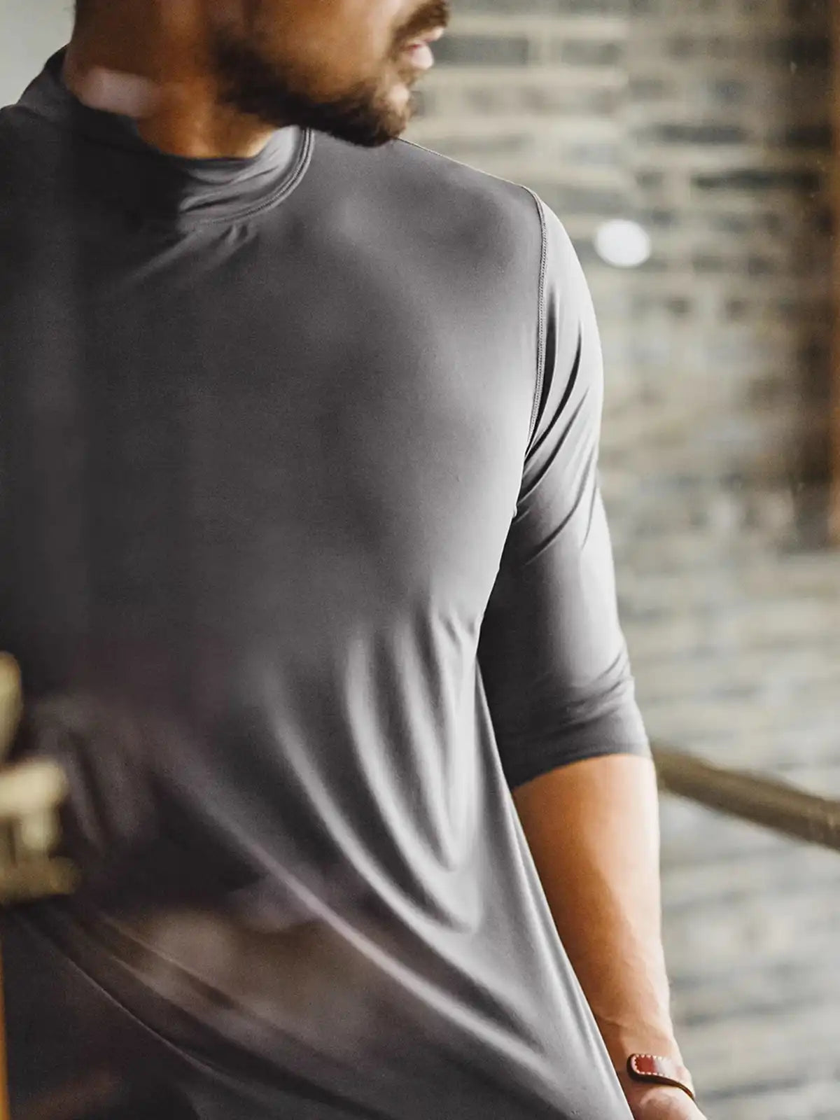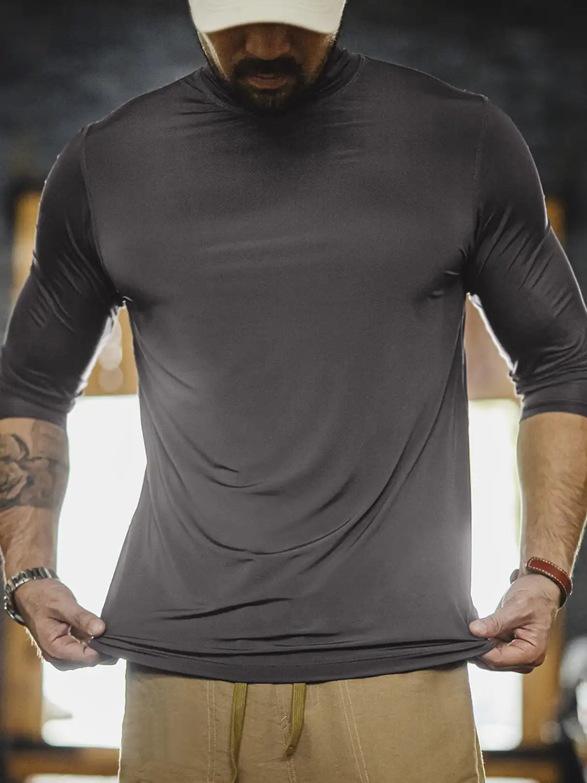 ナイロン84.6%とスパンデックス15.4%を配合したハイテク素材を使用。熱い時は透湿性で涼しく、寒い時は適度な保温力を発揮する自動温度調整機能を備える。滑らかな冰絲のような肌触りで、伸縮性に優れ、フィット感のあるシルエットが特徴。縫製には四本針六本糸のフラットシーマ構造を採用し、縫い目のごろつきをなくし「無感覚」の着心地を実現。スポーツから日常のレイヤードスタイルまで幅広く活用可能な一枚。